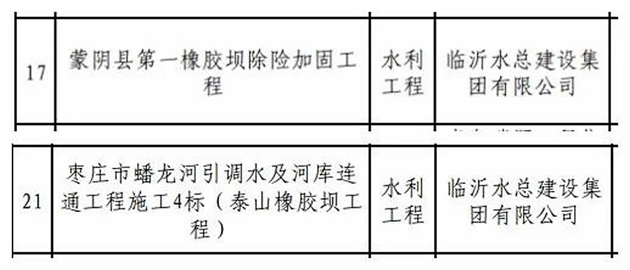 12月27日,山东省住房和城乡建设厅公布了“2023年山东省工程质量管理标准化示范工程(优质结构工程)名单”,临沂水总参建的蒙阴县第一橡胶坝除险加固工程、枣庄市蟠龙河引调水及河库连通工程施工4标(泰山橡胶坝工程)被评为2023年度省级优质结构工程。