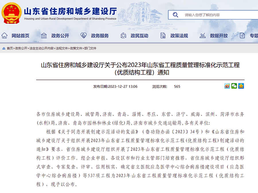 临沂水总两项目获评2023年山东省工程质量管理标准化示范工程(优质结构工程)